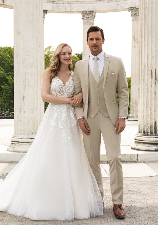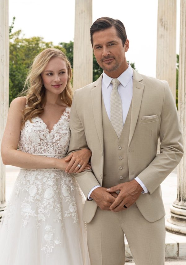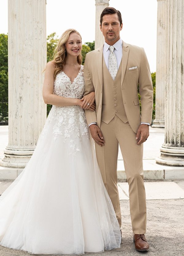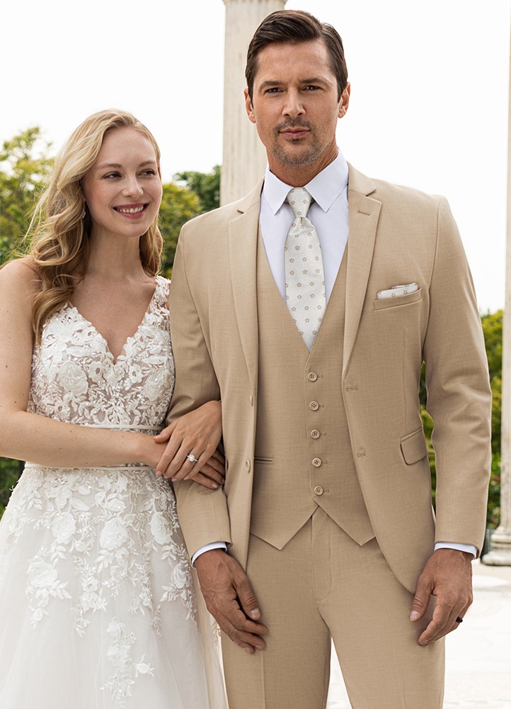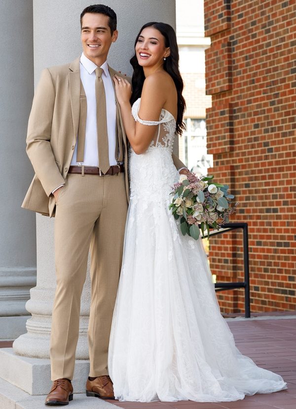 Perfect for spring or summer weddings, this tan suit brings an easy, laid-back feel without sacrificing style. Looks great with light ties, floral accents, or even open collars.