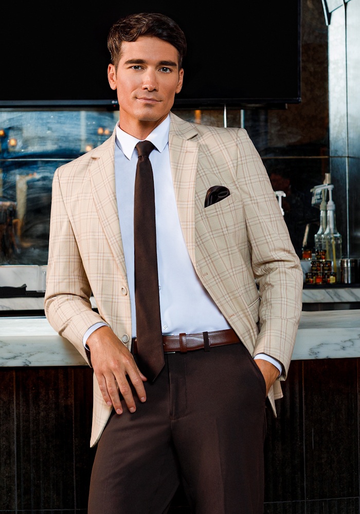 This tan plaid sportcoat adds some texture and interest without being too loud. Pair it with brown or sand-colored pants for a relaxed but put-together look. It looks great with jeans too!