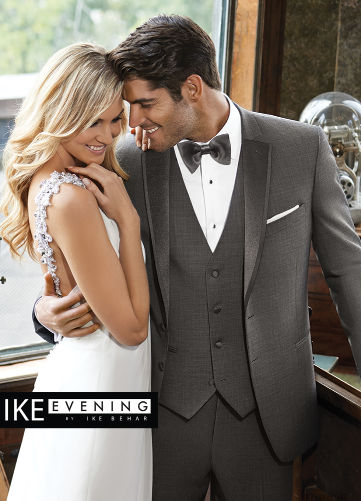 The Sharkskin Grey ‘Grayson’ Tuxedo by Ike Behar Evening is a beautifully made formal ensemble that fills a specific and growing need in our rental tuxedo offerings. We have grey tuxedos. We have slim fit tuxedos. But this style is our first slim fit grey tuxedo! Featuring a 2 button front, satin notch lapels with self trim, satin besom pockets, and fashioned from luxuriously soft medium grey Super 120’s Wool, this tuxedo is perfect for a wide variety of formal events, and anyone who prefers a more streamlined fit!