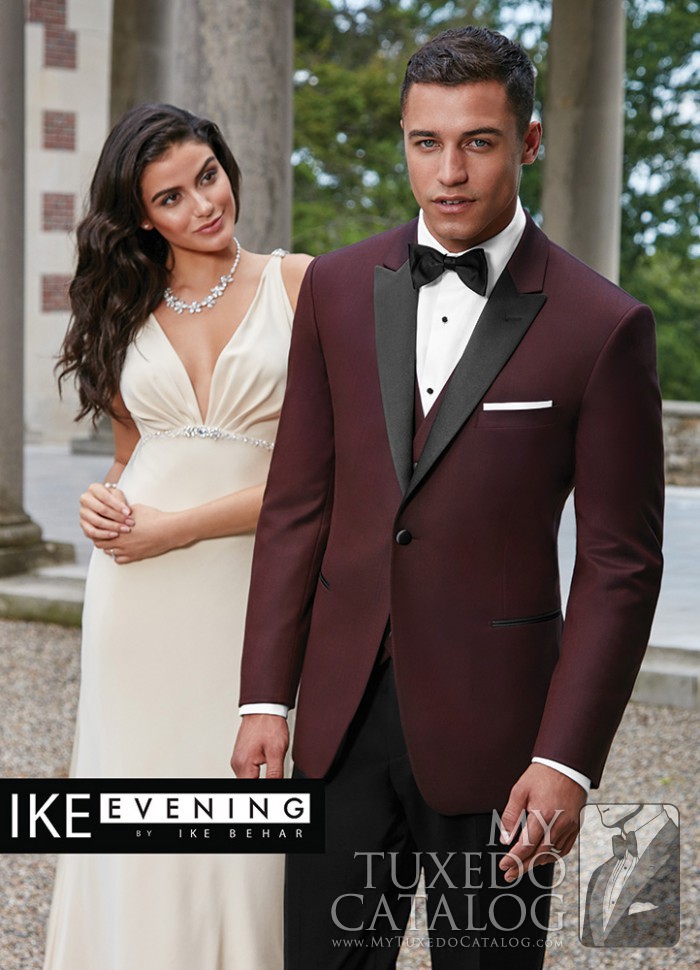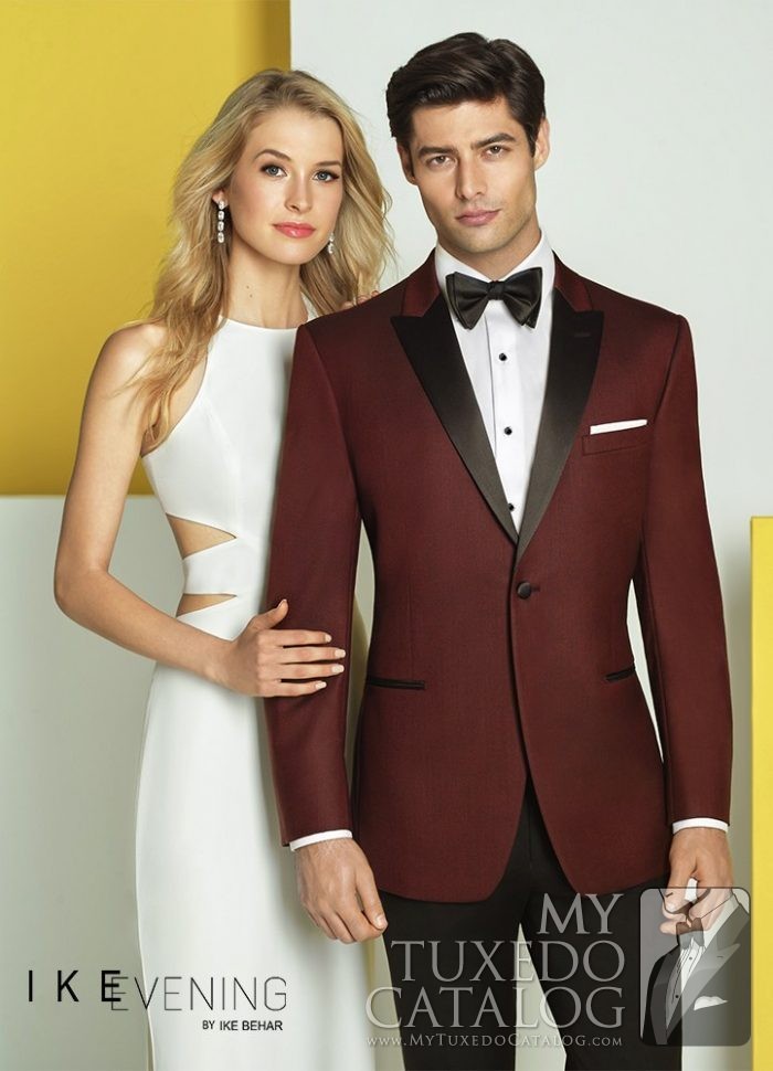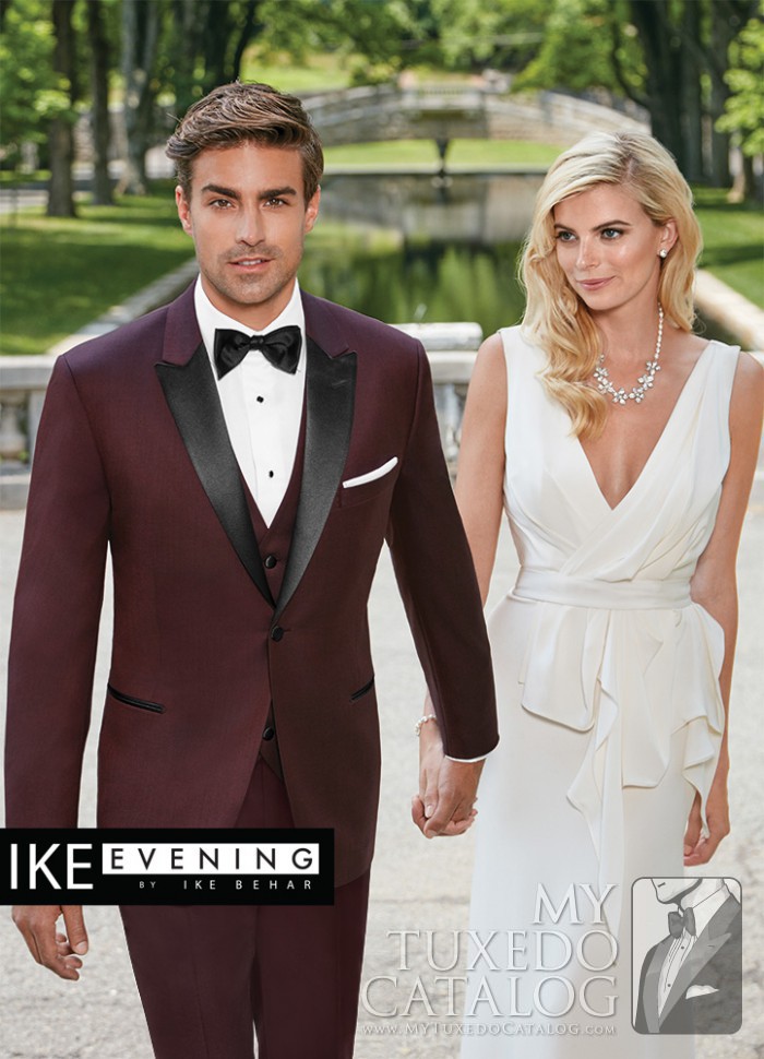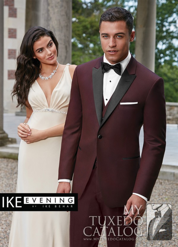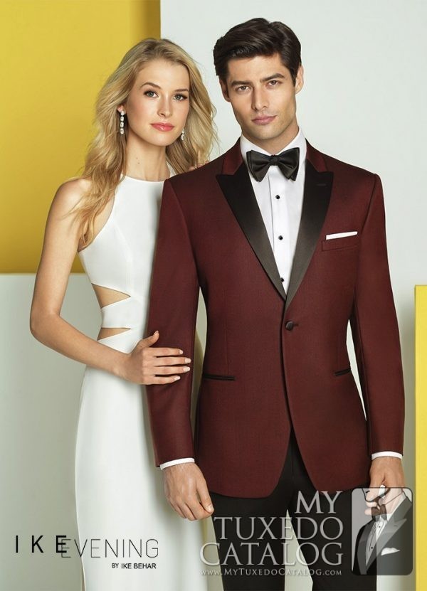 In response to red carpet looks and sharp dressing professional sportsmen, Ike Behar has made the burgundy 'Marbella' slim fit tuxedo! It features contrasting black satin peak lapels and a one button front and is made from luxurious super 120's wool. Matching trousers and vest are available, if you dare!