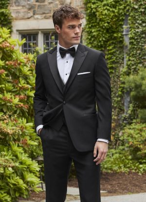The black ‘Henry’ slim tuxedo by Ike Behar is as classic and elegant and it is beautifully fitted. It features a 1 button single-breasted front, satin notch lapels, satin besom pockets, fashioned from soft stretch poly/wool fabric.